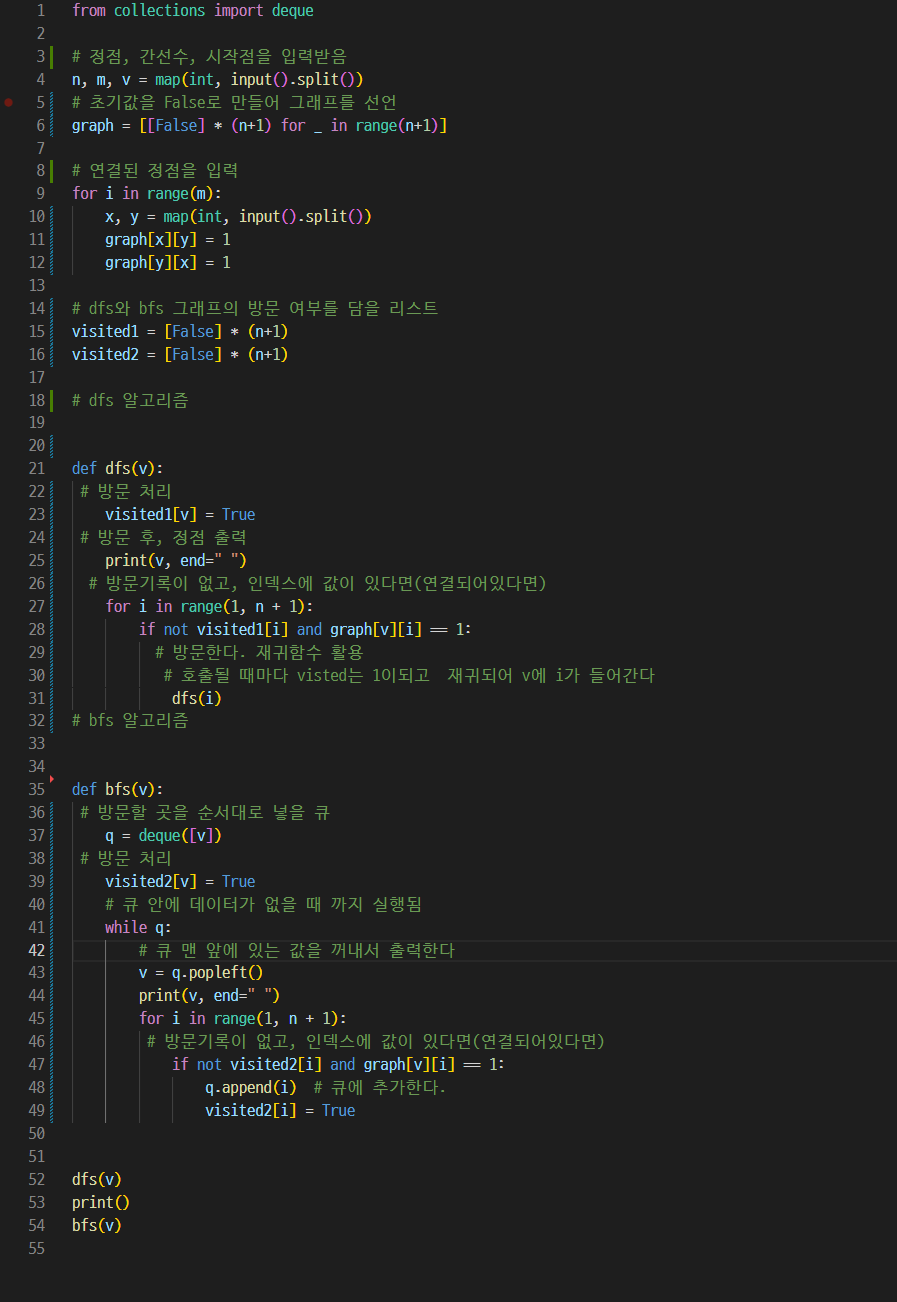 그래프를 DFS로 탐색한 결과와 BFS로 탐색한 결과를 출력하는 프로그램을 작성하시오. 단, 방문할 수 있는 정점이 여러 개인 경우에는 정점 번호가 작은 것을 먼저 방문하고, 더 이상 방문할 수 있는 점이 없는 경우 종료한다. 정점 번호는 1번부터 N번까지이다.
