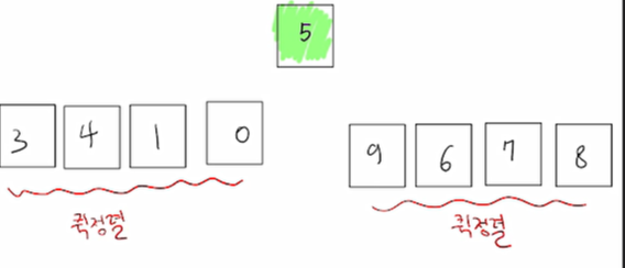 왼쪽과 오른쪽으로 나뉘어 왼쪽에는 피벗보다 작은 값, 오른쪽엔 피벗보다 큰 값을 배열로 만듬
