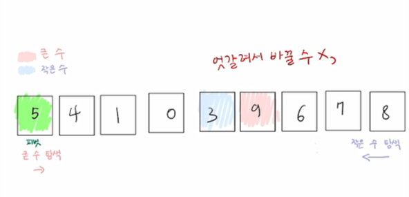 (2) 다시 왼쪽부터 탐색하여 피벗(5)보다 큰 수(9), 작은 수(3)의 위치를 바꿔주자