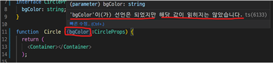 (2) 배경색을 받을 변수 bgColor를 string으로 선언한 interface CircleProps를 선언합니다.
